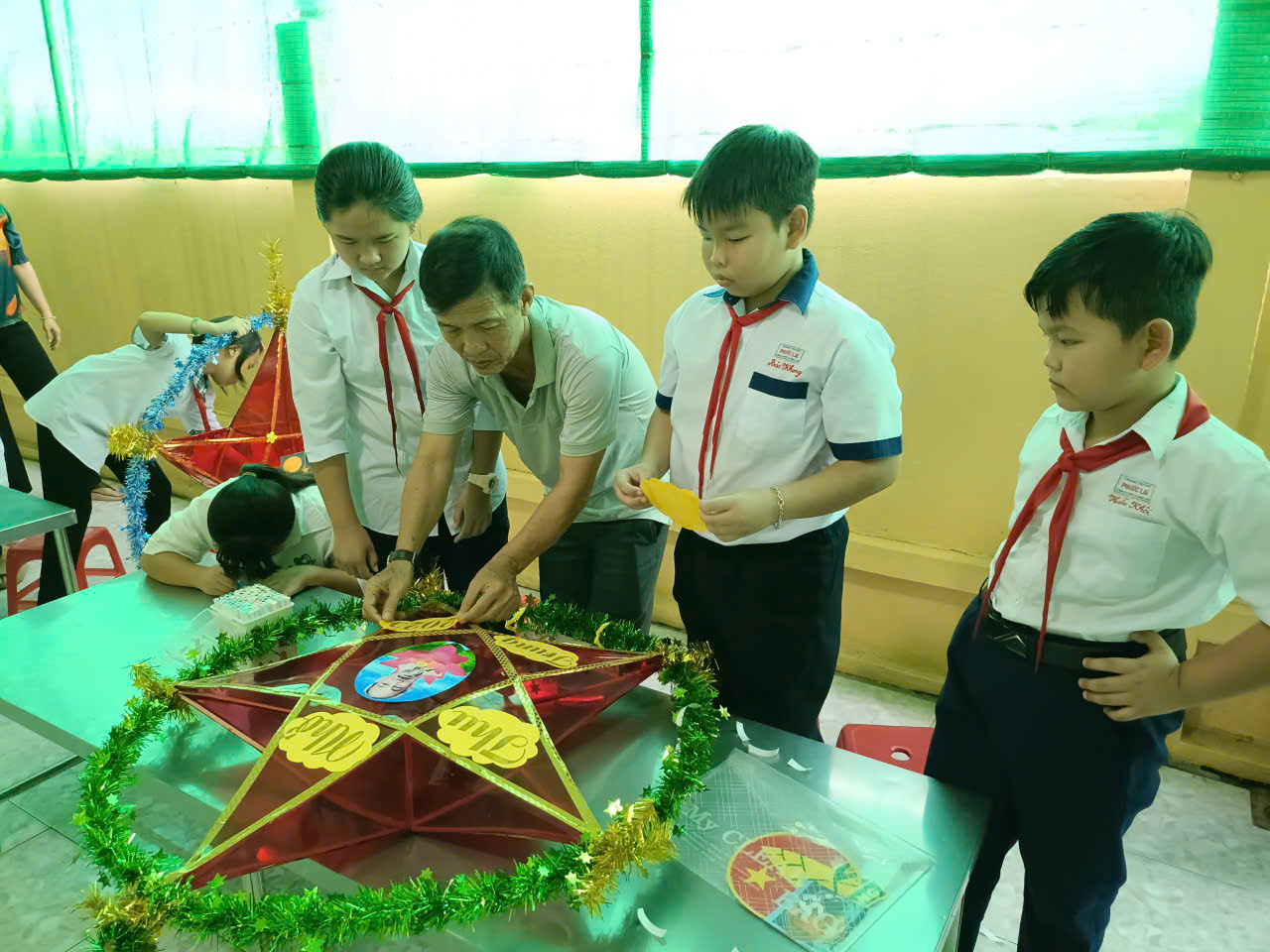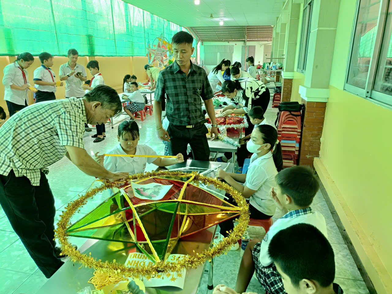 (Thầy cô giáo và các em học sinh trang trí lồng đèn Trung thu)