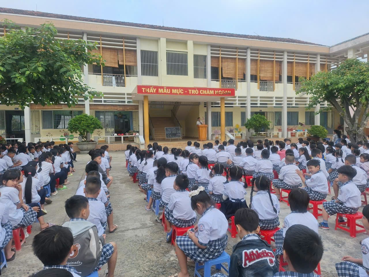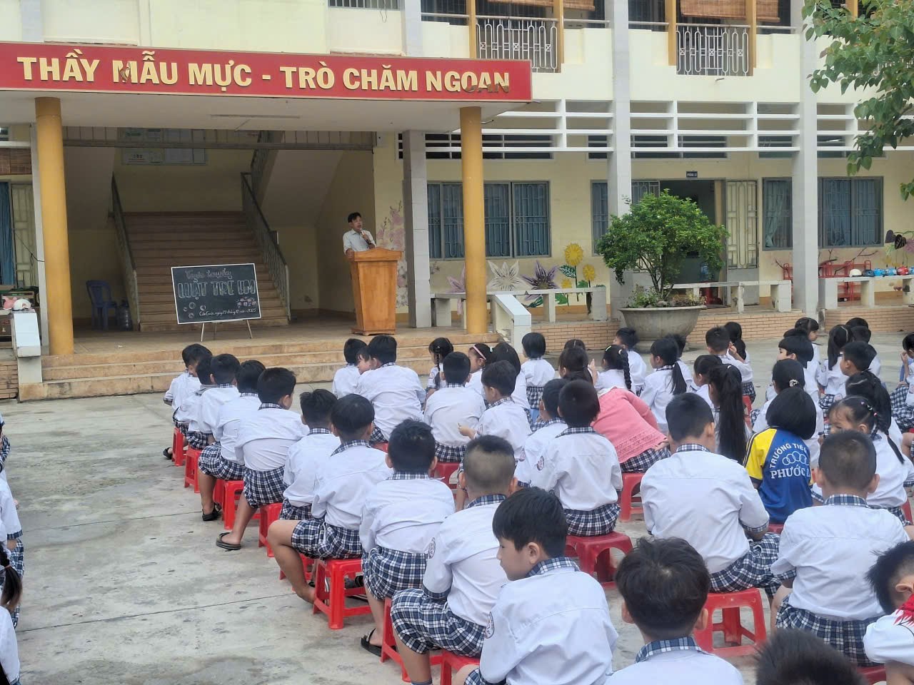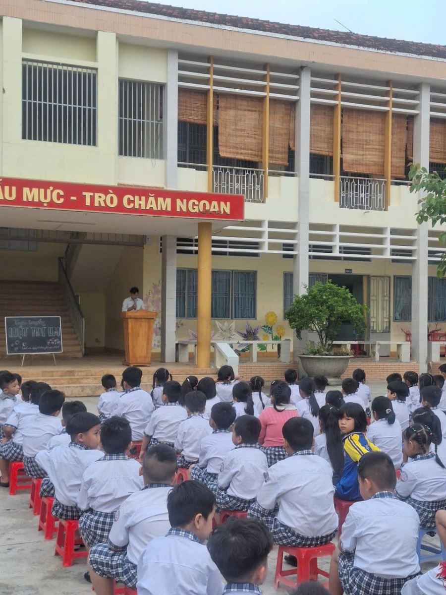Hình ảnh: Toàn thể cán bộ, giáo viên và học sinh tham dự buổi tuyên truyền Luật Trẻ em trong giờ sinh hoạt đầu tuần.