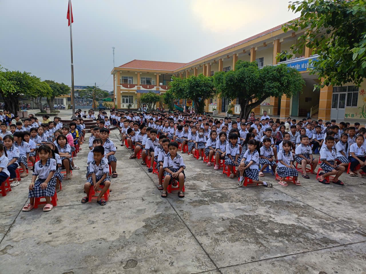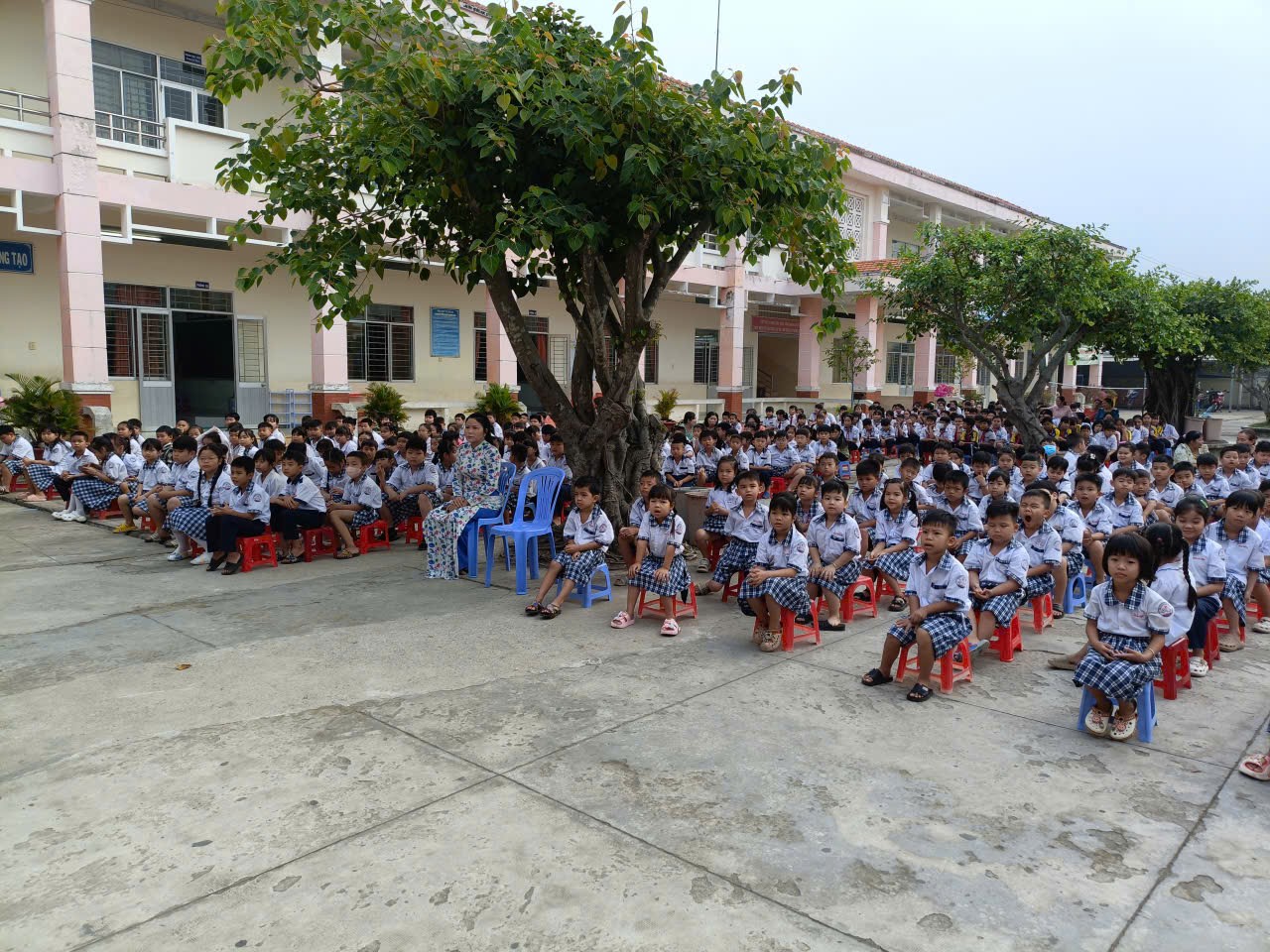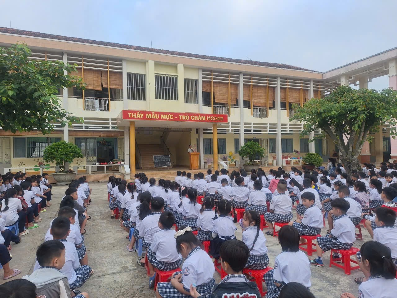 Hình ảnh: Toàn thể cán bộ, giáo viên và học sinh tham dự buổi tuyên truyền Luật Trẻ em trong giờ sinh hoạt đầu tuần.